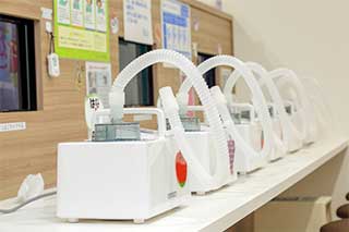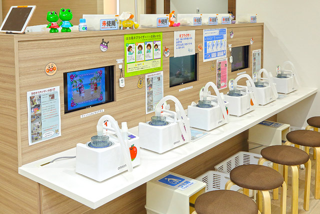 鼻、のどへのお薬の吸入です。お薬はお子さんが吸入しやすいように風味付けしてあります。また、飽きないようにDVDを観ながら吸入できます。