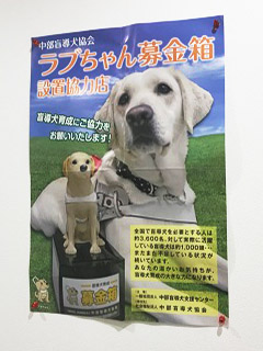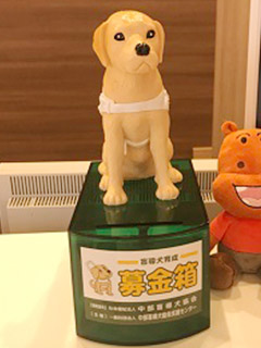 盲導犬の募金箱を設置しています。みなさまの温かい御支援、御協力よろしくお願いします。 また、玄関に設置してある有料のガチャガチャ。 この収益の全ては盲導犬協会に寄付されます。 御協力よろしくお願いします。
