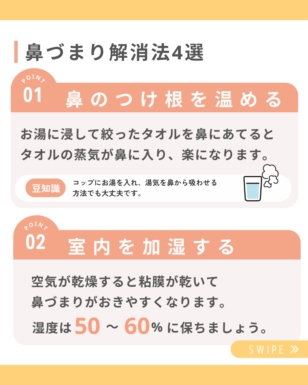 POINT 01: 鼻のつけ根を温める お湯に浸して絞ったタオルを鼻にあてると、タオルの蒸気が鼻に入り、楽になります。