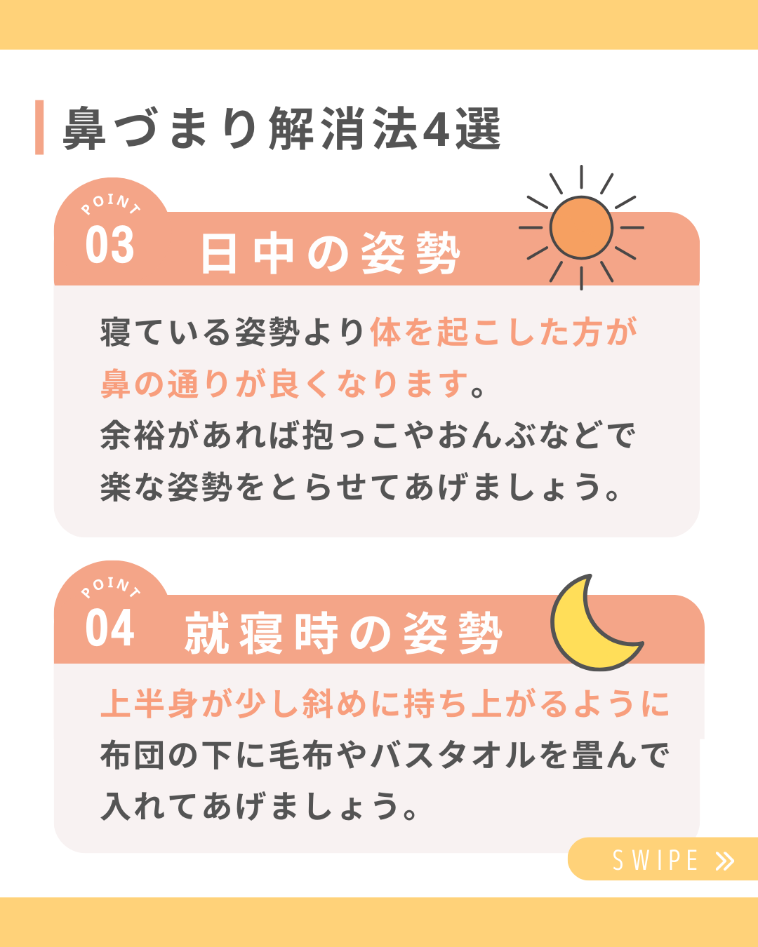 対処法や楽になる姿勢など、 お子様の鼻づまりでお困りの親御さんにぜひ見ていただきたい内容です!