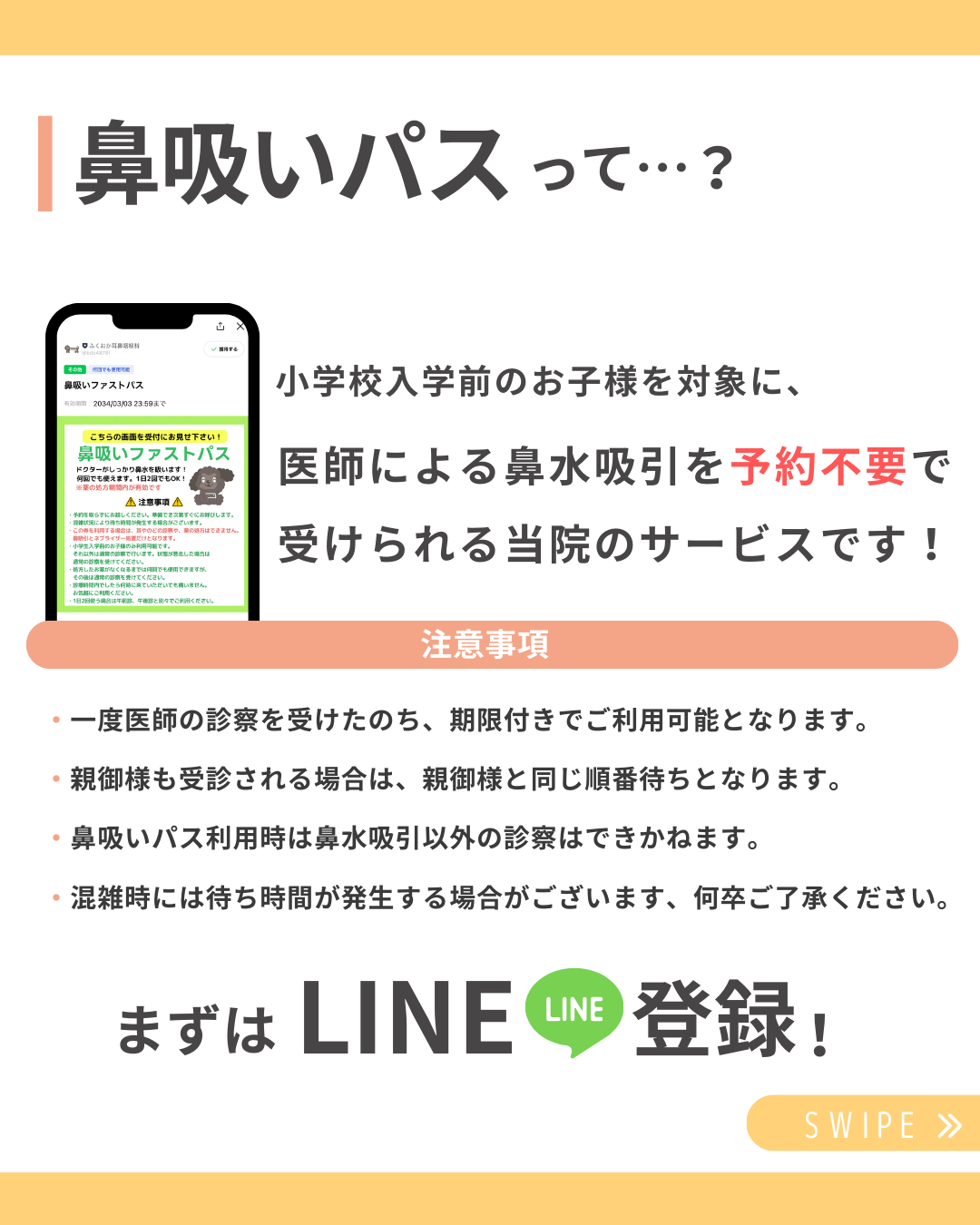 ・鼻吸いパス利用時は鼻水吸引以外の診察はできかねます。