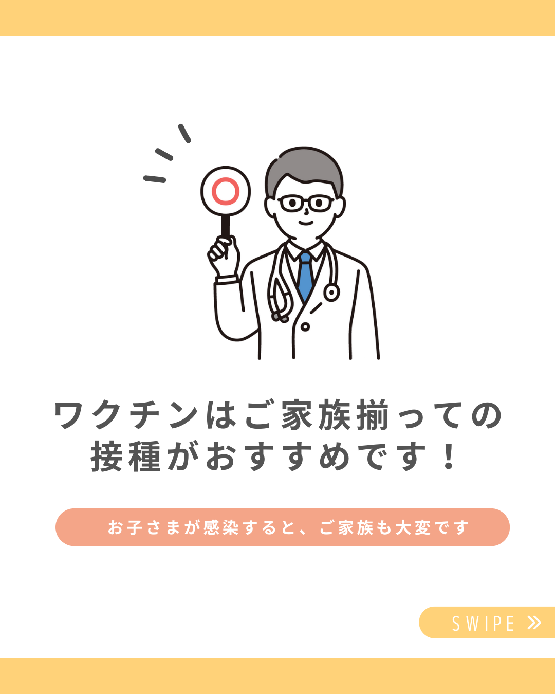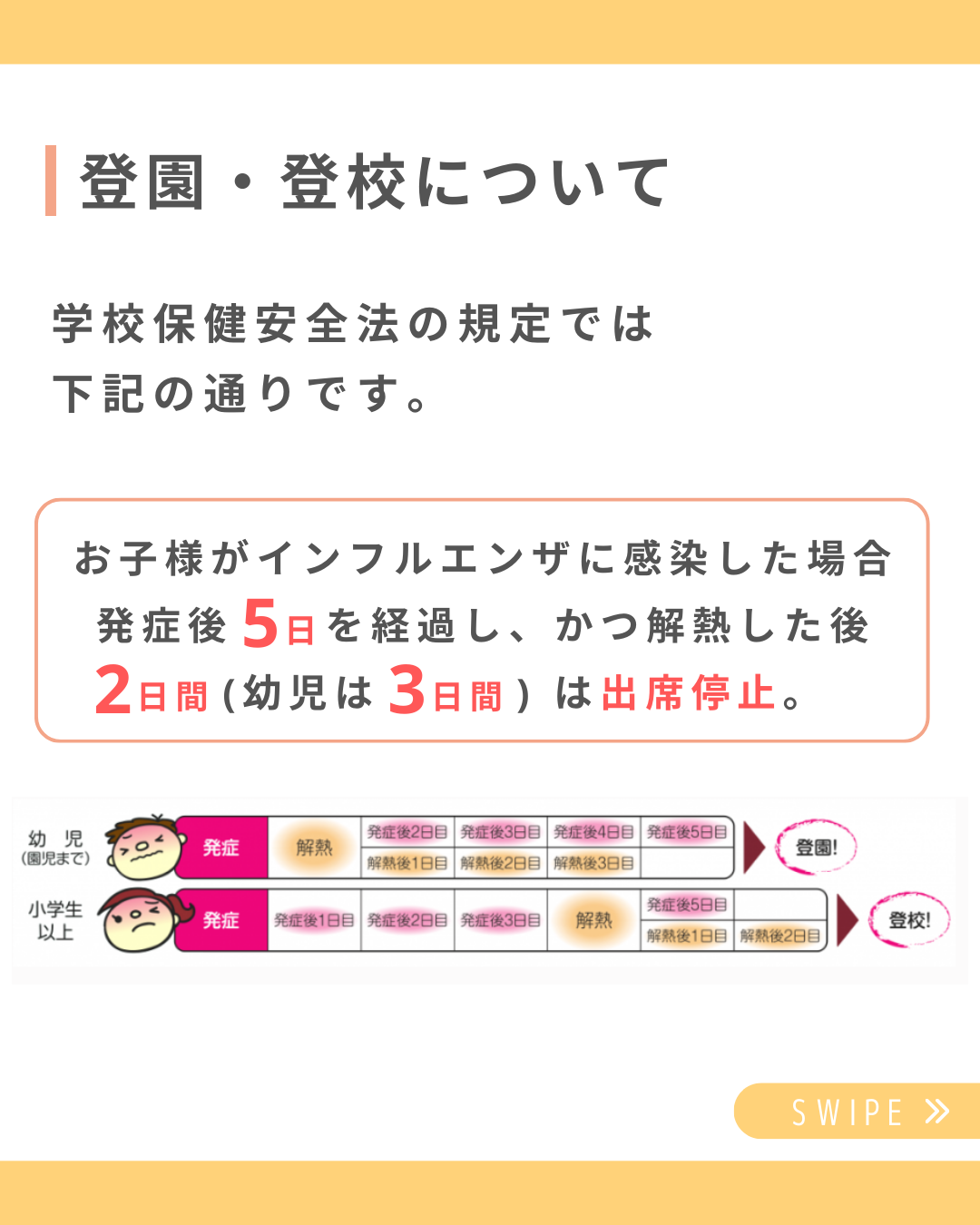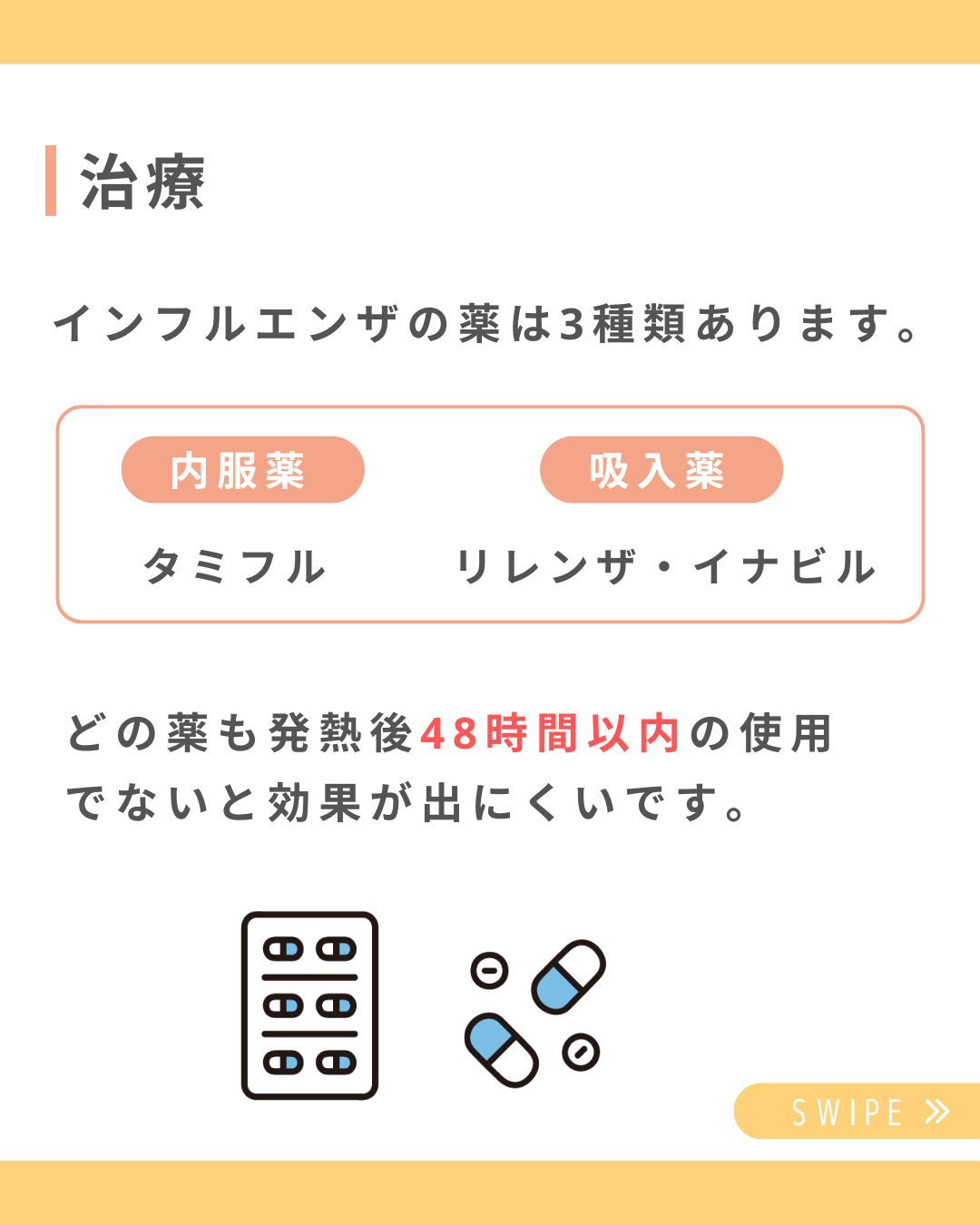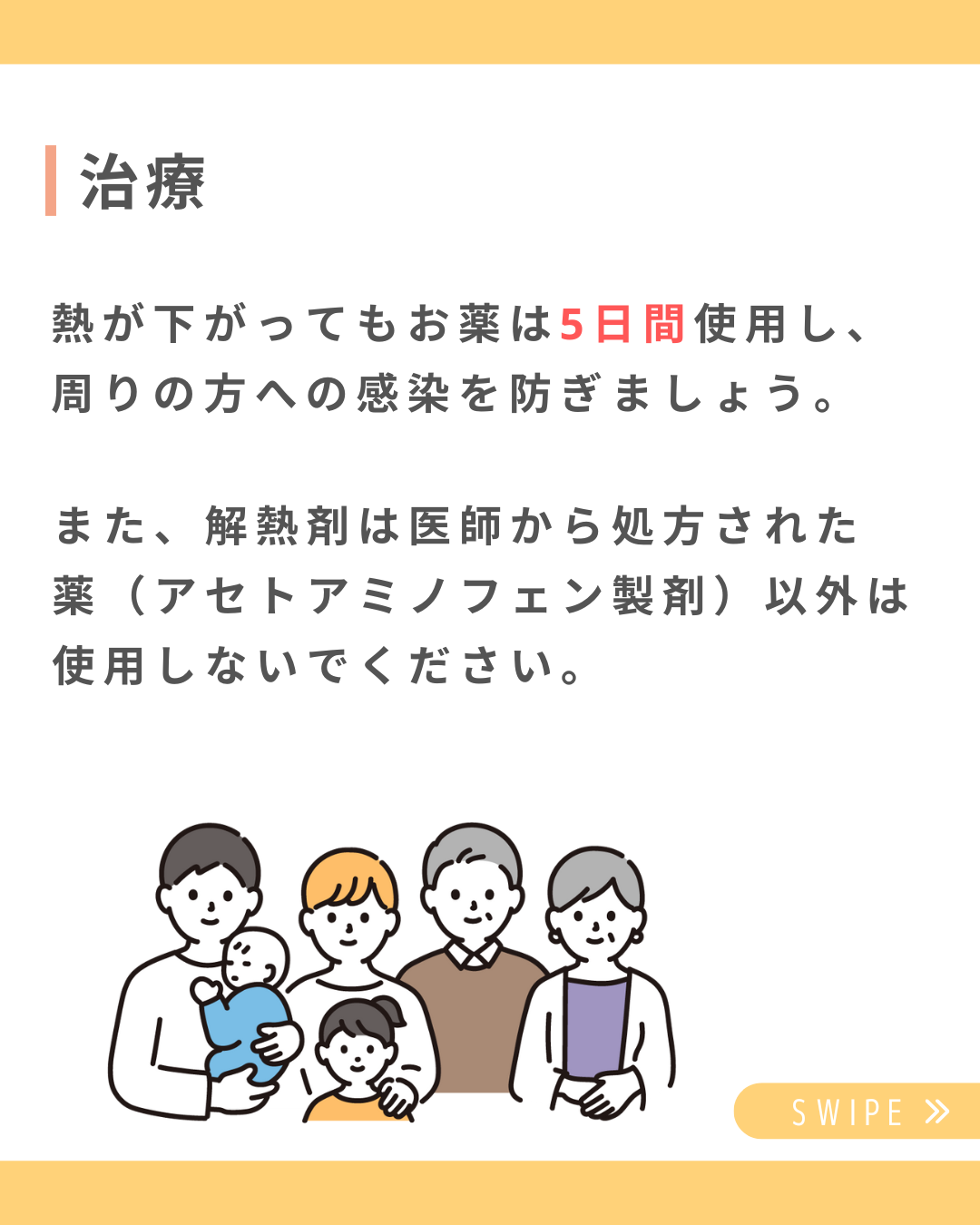熱が下がってもお薬は5日間使用し、周りの方への感染を防ぎましょう。