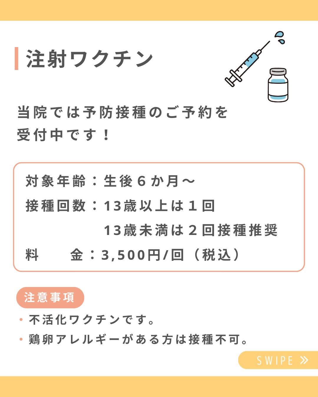 ・鶏卵、鶏肉、ゼラチンのアレルギーがある方は接種不可 ・免疫機能に異常のある疾患及び免疫抑制をきたす治療を受けている方は接種不可