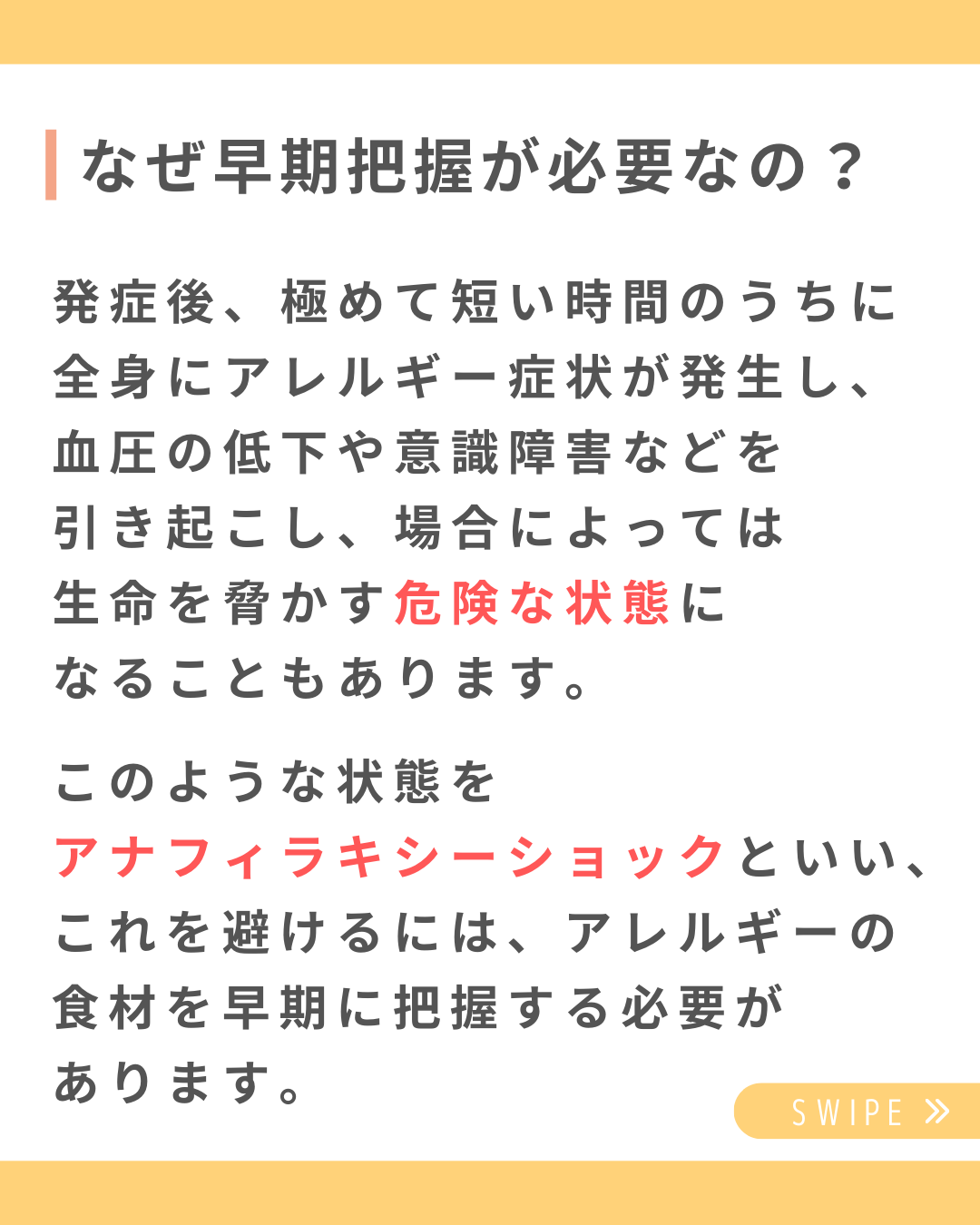 これを避けるには、アレルギー食材を早期に把握する必要があります。