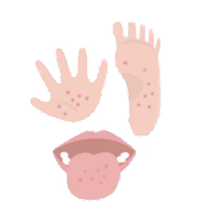 手のひら、足のうら、口の中に小さな複数の水疱ができます。ひじや膝、おしりにできることもあります。口の中の水疱が破れると、しみて痛いため、食事が食べにくくなります。