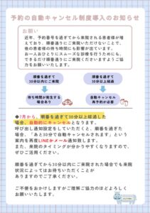 予約番号を過ぎてから来院される患者様が増えており、順番通りにご来院いただけないことで他の患者様の待ち時間にも影響が出ています。
